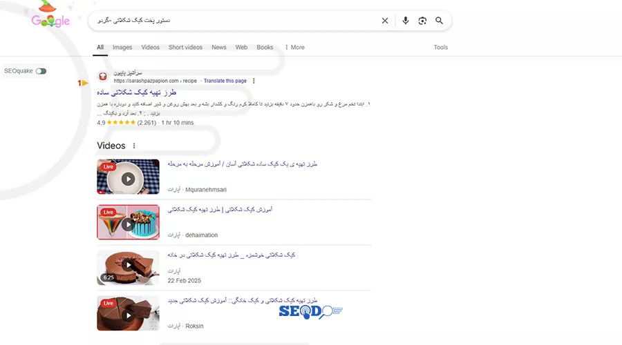 مثال: دستور پخت کیک شکلاتی -گردو (نتایج مربوط به کیک شکلاتی بدون گردو را نشان میدهد)